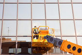 Pracownik, czyszczenie i naprawa ściany osłonowej od zewnątrz zamontowana na boom Żuraw