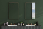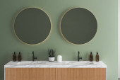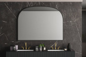 Wygodny biały zlewozmywak z owalnym lustrem stojącym na marmurowym blatze w nowoczesnej łazience z marmurowymi ścianami. 3d renderowanie