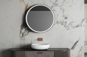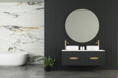 Nowoczesna luksusowa łazienka, białe marmurowe ściany, wanna, betonowa podłoga, wewnętrzne rośliny, toaleta, bidet, widok z przodu. Piękny pokój z nowoczesnymi meblami i oknem. 3d renderowanie