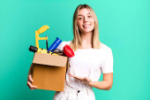 młoda ładna kobieta robi kapitulację lub gest pieniędzy, mówiąc, aby zapłacić ze skrzynki narzędziowej do naprawy jej mieszkania
