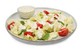Miska pysznej sałatki z kapustą chińską, ogórkiem, mięsem i pomidorami izolowane na białym, widok z góry