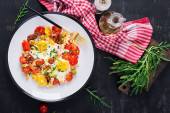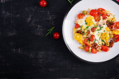 Zdjęcie "Sałatka z pomidorami i serem burrata z bazylią i oliwą z oliwek na talerzu. Włoskie jedzenie. Widok z góry, płaski" może być wykorzystywane do celów osobistych i komercyjnych zgodnie z warunkami zakupionej licencji Royalty-free. Obraz jest dostępny do pobrania w jakości wysokiej rozdzielczości do 5760x3840.