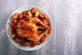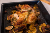 Pieczone nóżki z kurczaka z pieczonymi warzywami na tacy do pieczenia