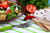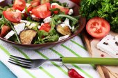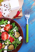 Sałatka z bakłażana z pomidory, rukola i feta ser w serwetkę, na tle drewniane kolor