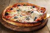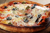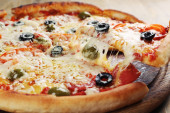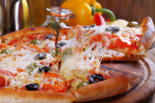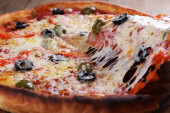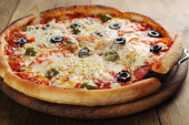 Zdjęcie "Pizza z serem na pokładzie i drewniany stół tło" może być wykorzystywane do celów osobistych i komercyjnych zgodnie z warunkami zakupionej licencji Royalty-free. Obraz jest dostępny do pobrania w jakości wysokiej rozdzielczości do 5760x3840.