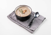 zupa grzybowa w ceramicznym talerzu z grzybami na planszy, zdrowy obiad