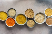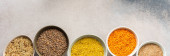 Różne zboża w miski baner, widok z góry