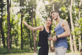 sprawny szczęśliwa para w słoneczny dzień łąki