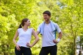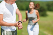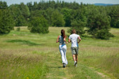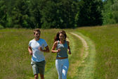 sprawny szczęśliwa para w słoneczny dzień łąki
