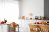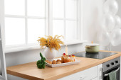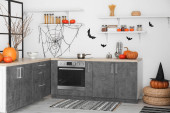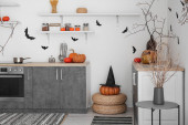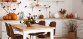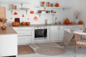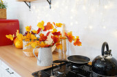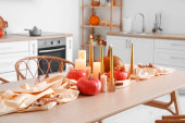 Dynie Halloween z opadłych liści i płonące świece na stole jadalnym w kuchni