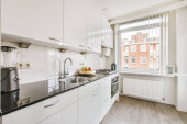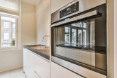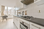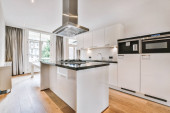 Zdjęcie "Duża narożna sofa z miękkimi poduszkami umieszczona pod eleganckim żyrandolem w pobliżu kominka elektrycznego w jasnym salonie w pobliżu kuchni" może być wykorzystywane do celów osobistych i komercyjnych zgodnie z warunkami zakupionej licencji Royalty-free. Obraz jest dostępny do pobrania w jakości wysokiej rozdzielczości do 5760x3840.