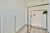 Duża narożna sofa z miękkimi poduszkami umieszczona pod eleganckim żyrandolem w pobliżu kominka elektrycznego w jasnym salonie w pobliżu kuchni