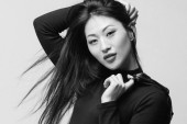 sexy dziewczyna w czarnej sukni stoi przed lustrem