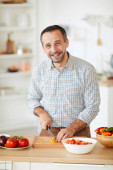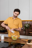 szczęśliwy brodaty człowiek gospodarstwa posiekane pomidory wiśniowe w pobliżu miski z sałatą i szklanką białego wina