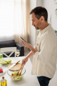 wesoły mężczyzna w białej koszuli rozmawiający przez telefon komórkowy stojąc przy lampce wina w kuchni