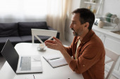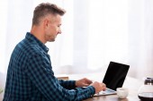 widok z boku szczęśliwy człowiek w okularach wpisując na laptopie z pustym ekranem w pobliżu pustego notebooka i filiżanki kawy