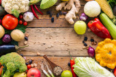 Rama warzyw na drewnianym tle, płaski skład układanki, koncepcja zbiorów, prawidłowe odżywianie, składniki i Święto Dziękczynienia.