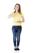 widok z przodu kobieta naciskając przycisk wyobraźni