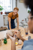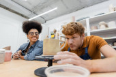 szczęśliwy międzyrasowy para odlewania gliny filiżanki podczas daty w studio ceramiki