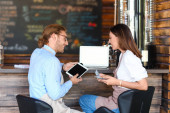 Właściciele firm pracujących z laptopem i tabletem w kawiarni