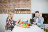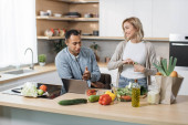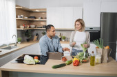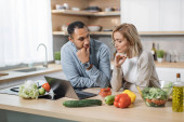 Przystojny indyjski mężczyzna i biały blondynka za pomocą laptopa wyszukiwania przepisów kulinarnych, zamawianie zakupów online, oglądanie lekcji gotowania podczas przygotowywania pyszne wegańskie sałatki ze świeżych warzyw.