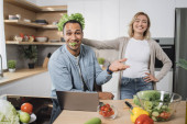 Zdjęcie "Przystojny indyjski mężczyzna i biały blondynka za pomocą laptopa wyszukiwania przepisów kulinarnych, zamawianie zakupów online, oglądanie lekcji gotowania podczas przygotowywania pyszne wegańskie sałatki ze świeżych warzyw." może być wykorzystywane do celów osobistych i komercyjnych zgodnie z warunkami zakupionej licencji Royalty-free. Obraz jest dostępny do pobrania w jakości wysokiej rozdzielczości do 5760x3840.