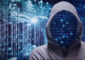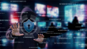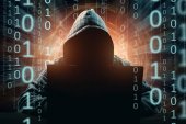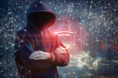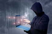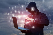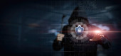 Haker siekać system na wirtualnym ekranie komputera na rozmytym tle.