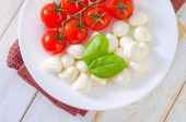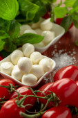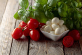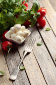 Ser Mozzarella z bazylią i pomidorami na starym drewnianym stole. Skupienie selektywne.