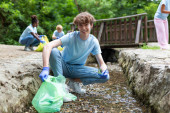 Człowiek zbierający śmieci ze słomek plastikowych z rzeki w parku. Światowy Dzień Środowiska.Koncepcja środowiska.