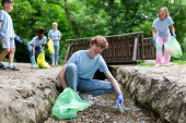 Grupa wesołych ludzi, ludzie z poczuciem natury, wolontariusze z workami na śmieci sprzątający teren parku.