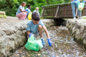 Grupa wolontariuszy sprzątających las z odpadów, koncepcja prac społecznych