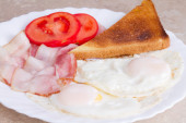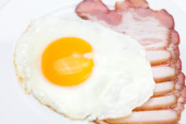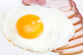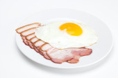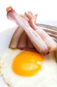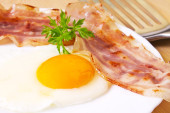 boczek z jajka sadzone na płytkę, widelec i chleb na w tle