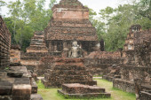 siedzi rzeźby Buddy wśród ruin w Sukhothai historyczne