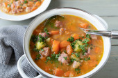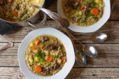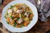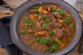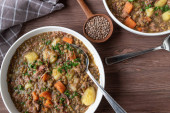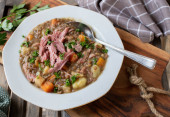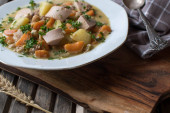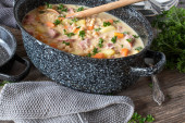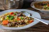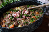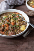 Gulasz soczewicowy z mięsem wieprzowym w rustykalnym garnku. Tradycyjne niemieckie danie białkowe