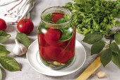 Szklany słoik z warzywami, ziołami i solanką na stole, zbliżenie