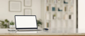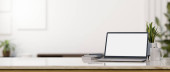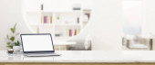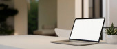 Close-up, Luksusowy jasny obszar roboczy z laptopem biały ekran makieta, filiżanka kawy, wystrój roślin i miejsca do kopiowania na białym marmurowym blatem na rozmytym tle. 3d renderowanie, ilustracja 3d