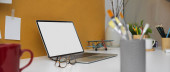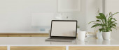 Zdjęcie "Close-up, Luksusowy jasny obszar roboczy z laptopem biały ekran makieta, filiżanka kawy, wystrój roślin i miejsca do kopiowania na białym marmurowym blatem na rozmytym tle. 3d renderowanie, ilustracja 3d" może być wykorzystywane do celów osobistych i komercyjnych zgodnie z warunkami zakupionej licencji Royalty-free. Obraz jest dostępny do pobrania w jakości wysokiej rozdzielczości do 5760x3840.