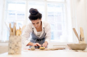 Zdjęcie "Warsztaty online. Urocza uśmiechnięta dziewczyna, mistrz garncarstwa z zapasami nagrywającymi vlog w domowym studio. Zainteresowania i rekreacja. Szkolenie zdalne, zajęcia online, reklama" może być wykorzystywane do celów osobistych i komercyjnych zgodnie z warunkami zakupionej licencji Royalty-free. Obraz jest dostępny do pobrania w jakości wysokiej rozdzielczości do 5760x3840.