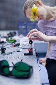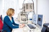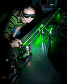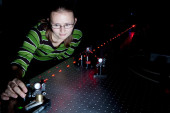 Kobieta naukowiec robi badania w laboratorium optyki kwantowej (kolor t