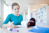 w bibliotece - ładne, kobiece studenta z laptopa i książki wo