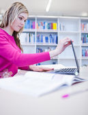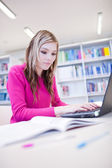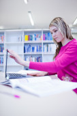 w bibliotece - ładne, kobiece studenta z laptopa i książki wo