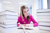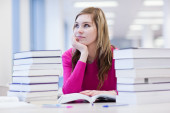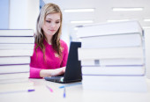 w bibliotece - ładne, kobiece studenta z laptopa i książki wo