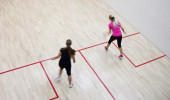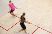 Dwóch zawodników squasha kobiet w szybkiej akcji na kort do squasha (moti