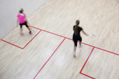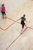 Dwóch zawodników squasha kobiet w szybkiej akcji na kort do squasha (moti