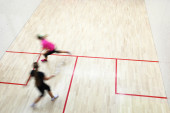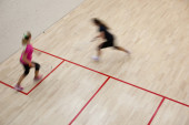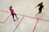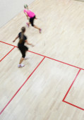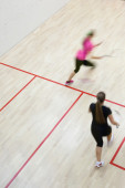 Dwóch zawodników squasha kobiet w szybkiej akcji na kort do squasha (moti