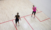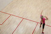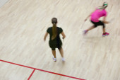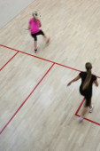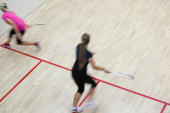 Dwóch zawodników squasha kobiet w szybkiej akcji na kort do squasha (moti