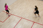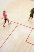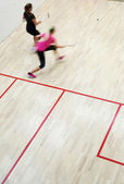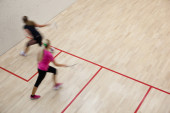 Dwóch zawodników squasha kobiet w szybkiej akcji na kort do squasha (moti