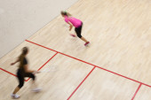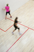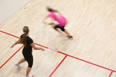 Dwóch zawodników squasha kobiet w szybkiej akcji na kort do squasha (moti