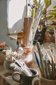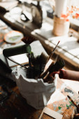 wazon stiukowy i dzbanek z narzędziami artystycznymi w pobliżu książek i łuski vintage na szorstkim parapecie z plamami farby