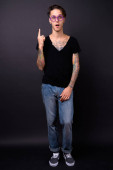 wesoły tatuaż nonbinary osoba w masce party stoi z rękami w kieszeniach na szarym tle